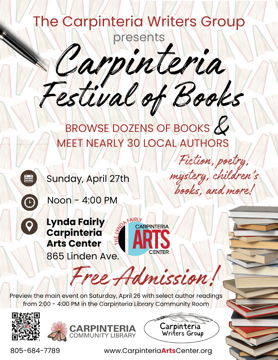 The Carpinteria Festival of Books, sponsored by the Carpinteria Writers Group, Lynda Fairly Arts Center, and Carpinteria Community Library will take place Sunday, April 27, 2025 in the Carpinteria Arts Center Courtyard. More than 25 local-area authors across all genres and age groups will be on hand to share and sell their works. The free festival runs from noon to 4:00 pm and is a rain-or-shine event. Preview the main event on Saturday, April 26, from 2-4pm with select author readings in the Carpinteria Library Community Room. For more information visit https://carpinteriaartscenter.org/festivalofbooks