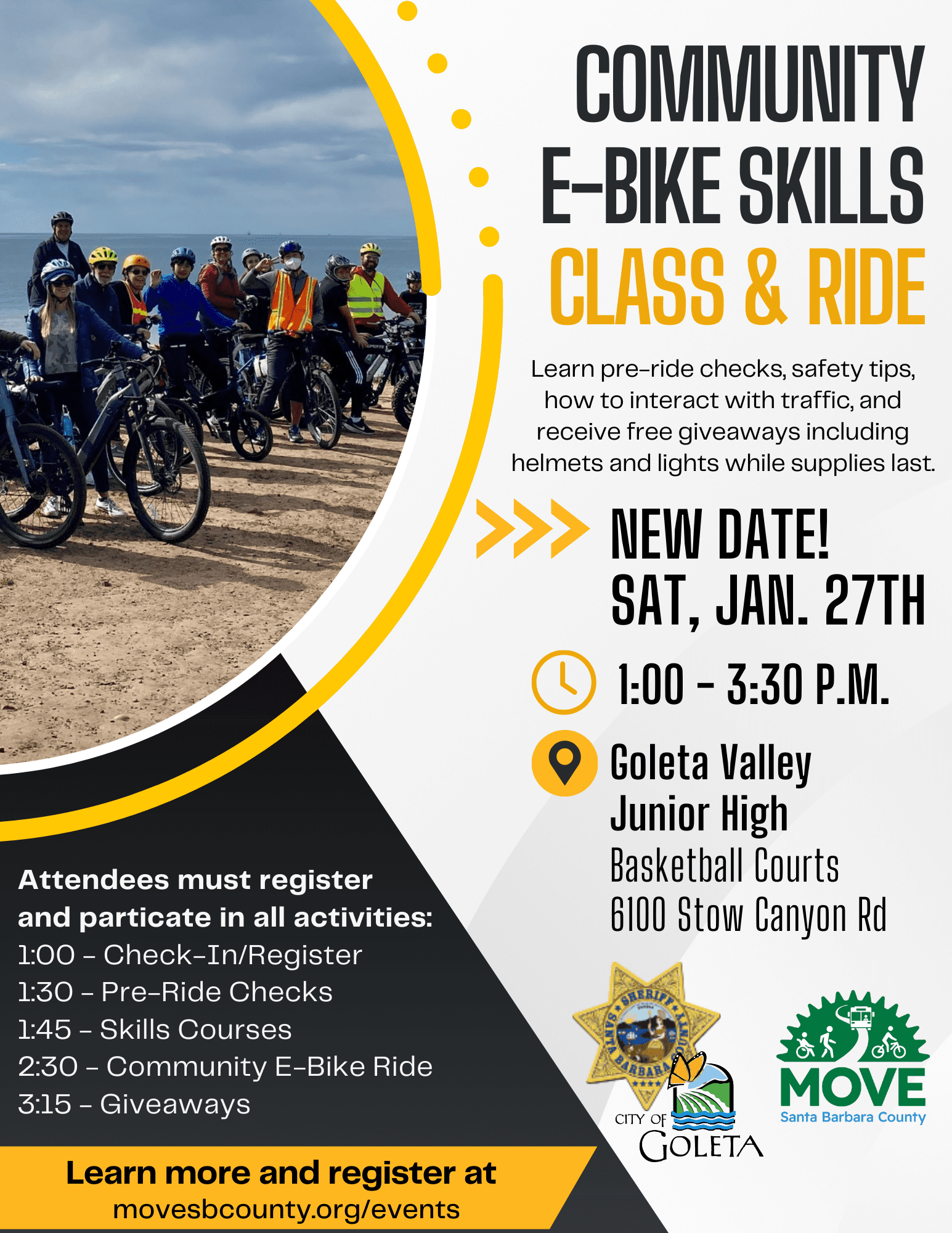 The event is a collaboration with the City of Goleta and MOVE Santa Barbara County as part of E-Bike Safety Awareness Week held last week (January 15-21). Whether you are a new or seasoned e-bike rider, this is a great opportunity to enhance skills and gain valuable safety knowledge.