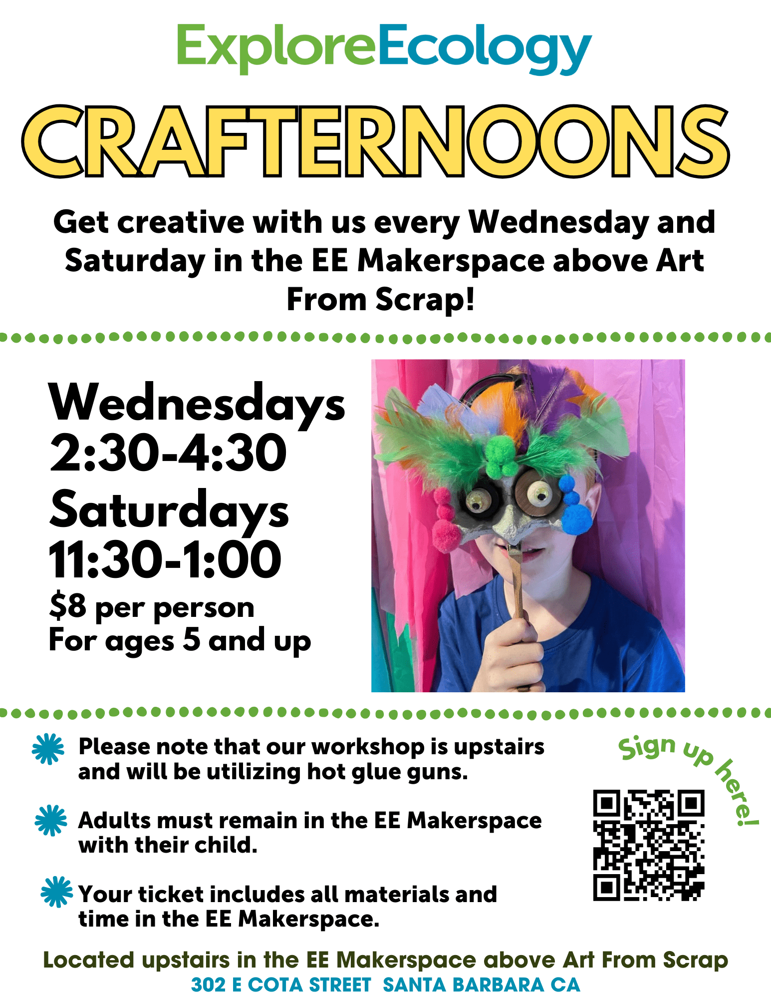Please note our workshop is upstairs and uses hot glue guns. Adults must remain in the EE Makerspace with their child.