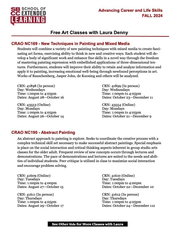 Beginning Drawing, Abstract Painting and New Techniques in Painting and Mixed Media offered in person and online August 26-December 13.