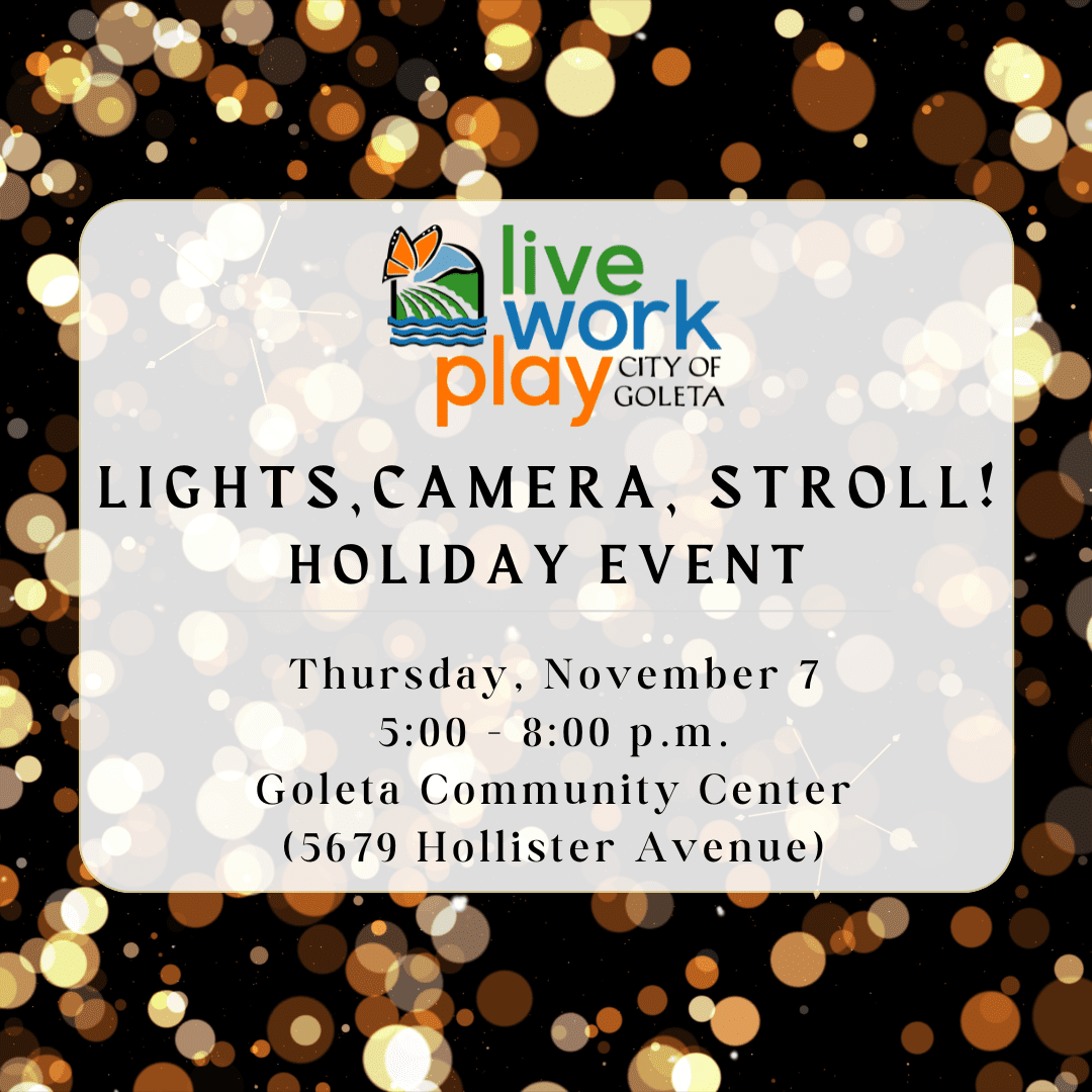 Join us on November 7th from 5:00 to 8:00 p.m. for an exciting event as we unveil the holiday lights along Hollister Avenue and take a community stroll to support businesses in Old Town! This is a momentous occasion in Goleta history, and we want YOU to be part of it! Celebrate with us at the Goleta Community Center (5679 Hollister Ave) as we enjoy a festive atmosphere, snap a photo with Mr. and Mrs. Claus, grab free hot chocolate and donuts courtesy of the Greater Goleta Santa Barbara Lions Club, and explore special offerings from local businesses as you stroll down Old Town to see the lights. ?? ??