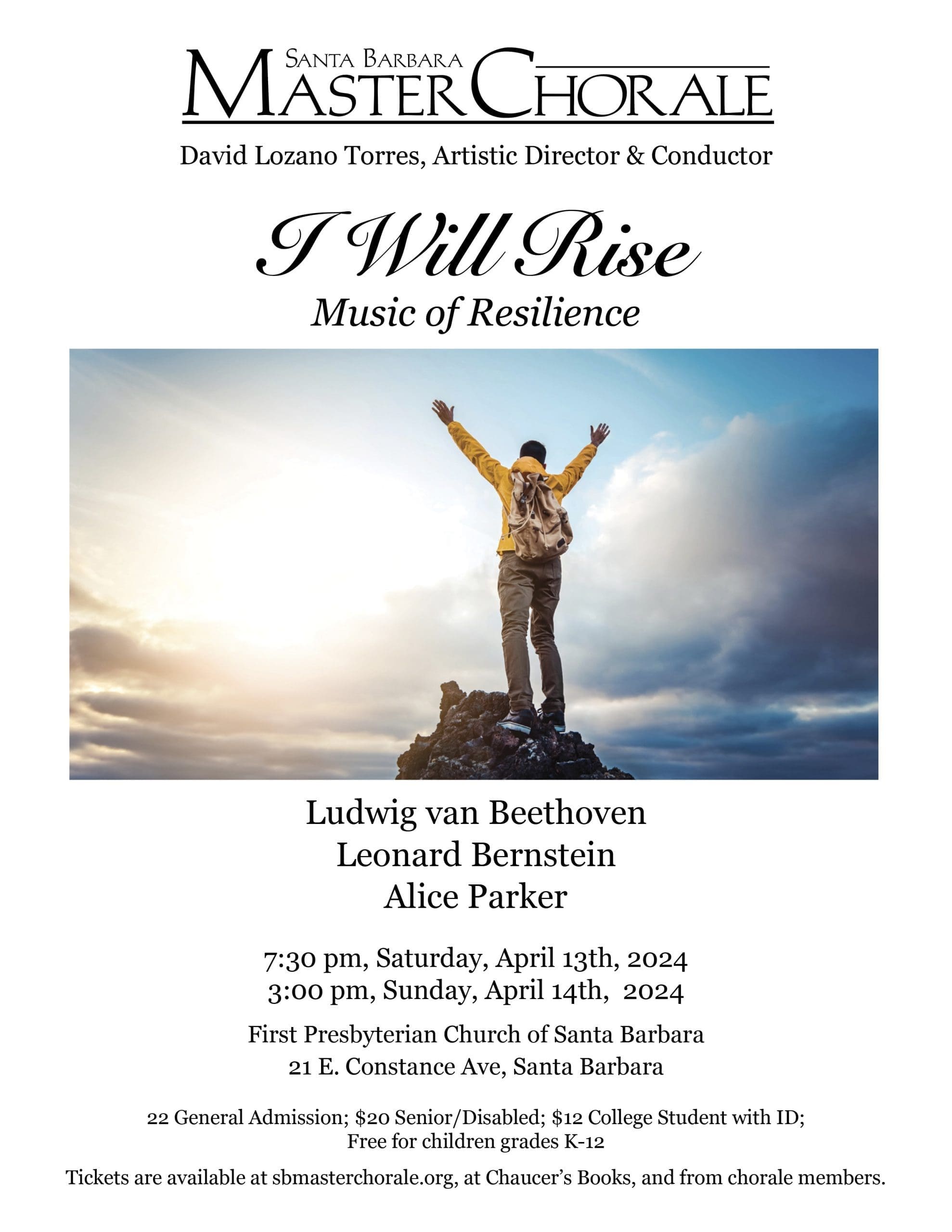 On Saturday, April 13 at 7:30 and Sunday, April 14 at 3 p.m., the Santa Barbara Master Chorale will present this concert, featuring works of Ludwig van Beethoven, Leonard Bernstein, Alice Parker, and others. The pieces chosen focus on humanity’s resilience to struggle and thus to flourish.