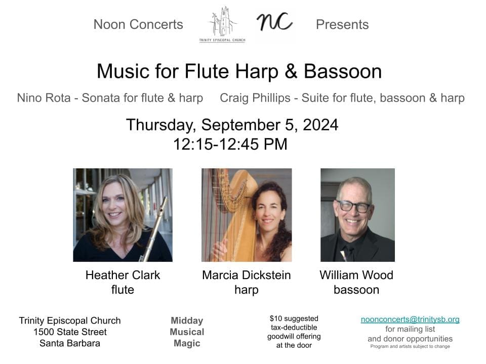 Noon Concerts at Trinity Santa Barbara opens the Fall 2024 season on Thursday, September 5, 2024 with Music for Flute, Bassoon and Harp featuring Heather Clark, flute, William Wood, bassoon, and Marcia Dickstein, harp. Ms. Clark and Ms. Dickstein will perform Nino Rota’s Sonata for Harp and Flute (1937). They will be joined by Mr. […]