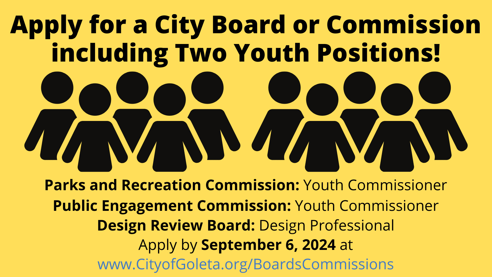 Apply by September 6 at 5:00 p.m. The City of Goleta has extended the deadline to apply to serve on a Board or Commission to September 6, 2024. The Parks and Recreation Commission and Public Engagement Commission are both looking to fill a youth position. If you are a teen ages 15 – 18, we encourage […]