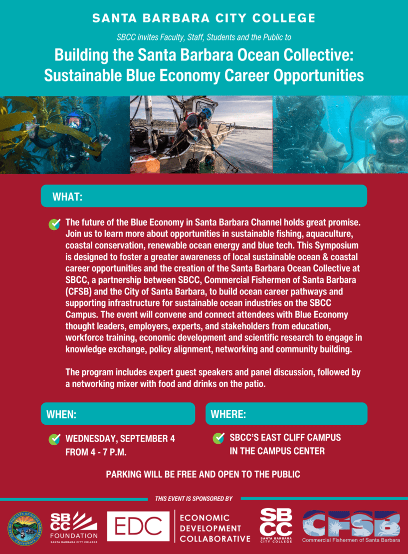 Santa Barbara City College (SBCC) is proud to announce the inaugural Blue Economy Symposium, an event dedicated to exploring and expanding sustainable ocean and coastal career opportunities within the Santa Barbara Channel. The symposium will take place on Wednesday, Sept. 4, 4 -7 p.m., at the SBCC East Cliff Campus Campus Center. The event — […]