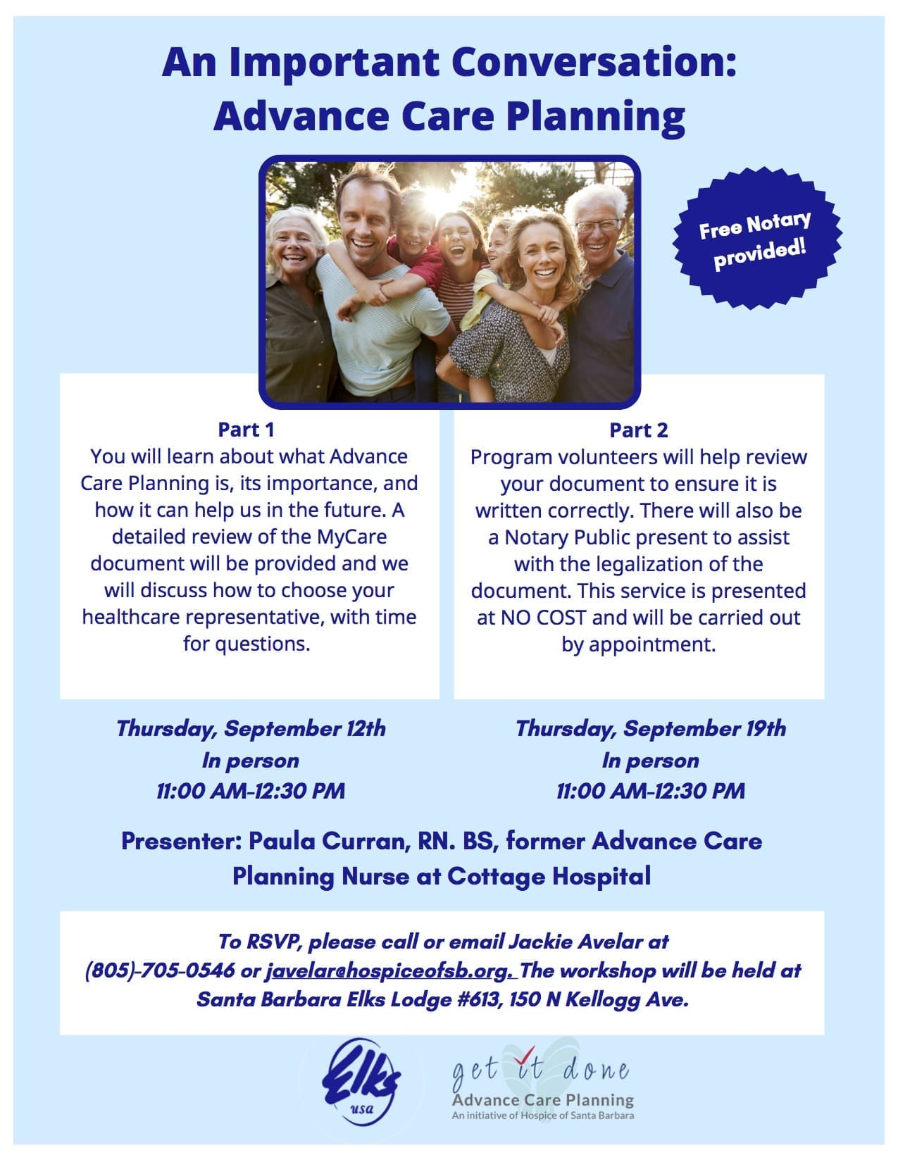 TWO VALUABLE WORKSHOPS ON ADVANCE CARE PLANNING Open to the Public - Free Entry and Free Parking Thursday, Sept. 12, 2024 11:00AM - 12:30PM and Thursday, Sept. 19, 2024 11:00AM - 12:30PM RSVP not required, but appreciated: Please contact Jackie Avelar at 805-705-0546 or email javelar@hospiceofsb.org Held at the Santa Barbara Elks Lodge #613 150 […]