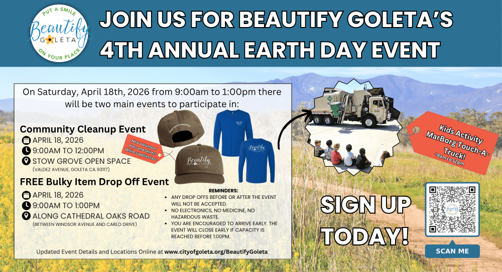 Community Cleanup Features Zero-Waste Prizes, Interactive Educational Activities and a Bulky Item Drop-Off The City of Goleta is thrilled to announce the 4th Annual Beautify Goleta Earth Day event, taking place on Saturday, April 18, 2026, from 9:00 a.m. to 12:00 p.m. This year’s community-wide cleanup and educational event will be centralized at Stow Canyon Open Space (on […]