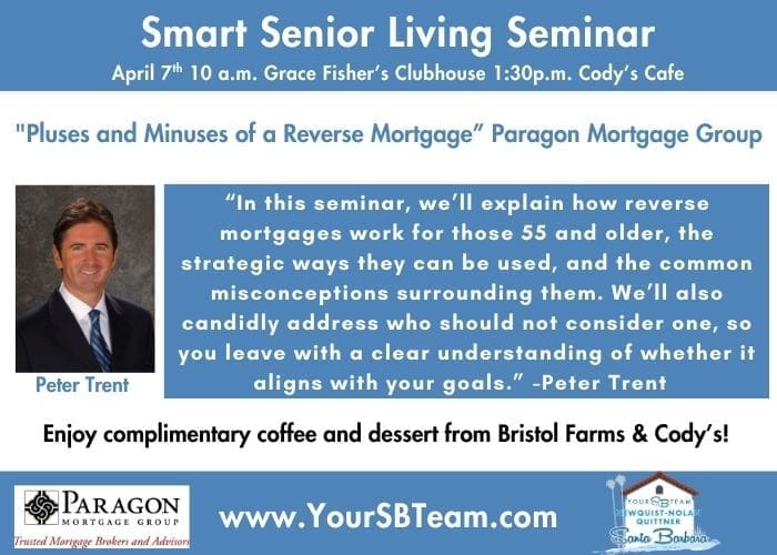 Smart Senior Living Seminar with Peter Trent of Paragon Mortgage Group and Your SB Team "The Pluses and Minuses of a Reverse Mortgage" Where: 10 a.m. Grace Fisher's Clubhouse in La Cumbre Plaza (catty corner to Williams Sonoma) 1:30 p.m. Cody's Cafe in their event room When: April 7th RSVP: www.yoursbteam.com/events or […]