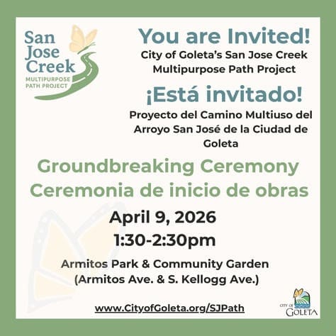 Join Us at 1:30 p.m. at Armitos Park Community Garden You are invited to celebrate the start of construction on the San Jose Creek Multipurpose Path – three miles of pathway linking northern Goleta neighborhoods and key destinations such as Old Town, the Coast Route and the beach. Join us for a groundbreaking ceremony on Thursday, April […]