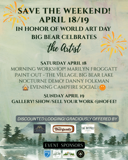 The Public is invited to view some amazing artists and artwork! April 18th, 12PM - 5PM Village Paint Out Artists will be painting the Village! You are welcome to stroll through and watch an artist put the Village to Canvas! April 19th, 10AM - 2PM Attend the Gallery Artists will Show/Sell their work. Destination Big Bear, 713 Stocker […]