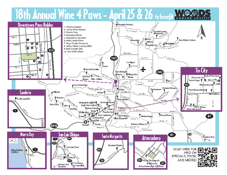 Participating Wine Country Businesses will Donate 10% of Proceeds to Woods Humane Society (April 10, 2026) — Wine 4 Paws, the weekend of wine country fundraising for homeless pets at Woods Humane Society, announces its 2026 tasting map featuring more than 75 local participating wineries, olive oil companies, restaurants serving breakfast, lunch and dinner, hotels & tour companies, and other participating businesses. All […]