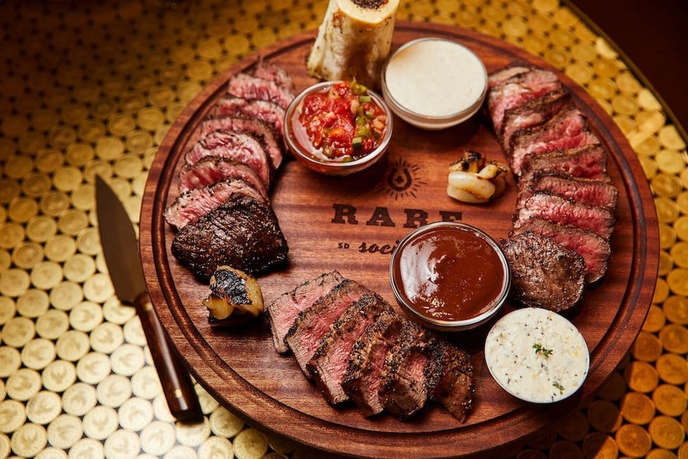 Entering this sleek spot with its black leather booths and velvet cushioned seats complete with gold embellishments and a signature cocktail which boasts dry-aged beef washed bourbon, rosemary oleo, and bitters, I wasn’t sure if I was in Vegas or good old SB. It turns out at Rare Society, the sophisticated yet cozy steakhouse nestled in the Funk Zone, you can have the best of both worlds.