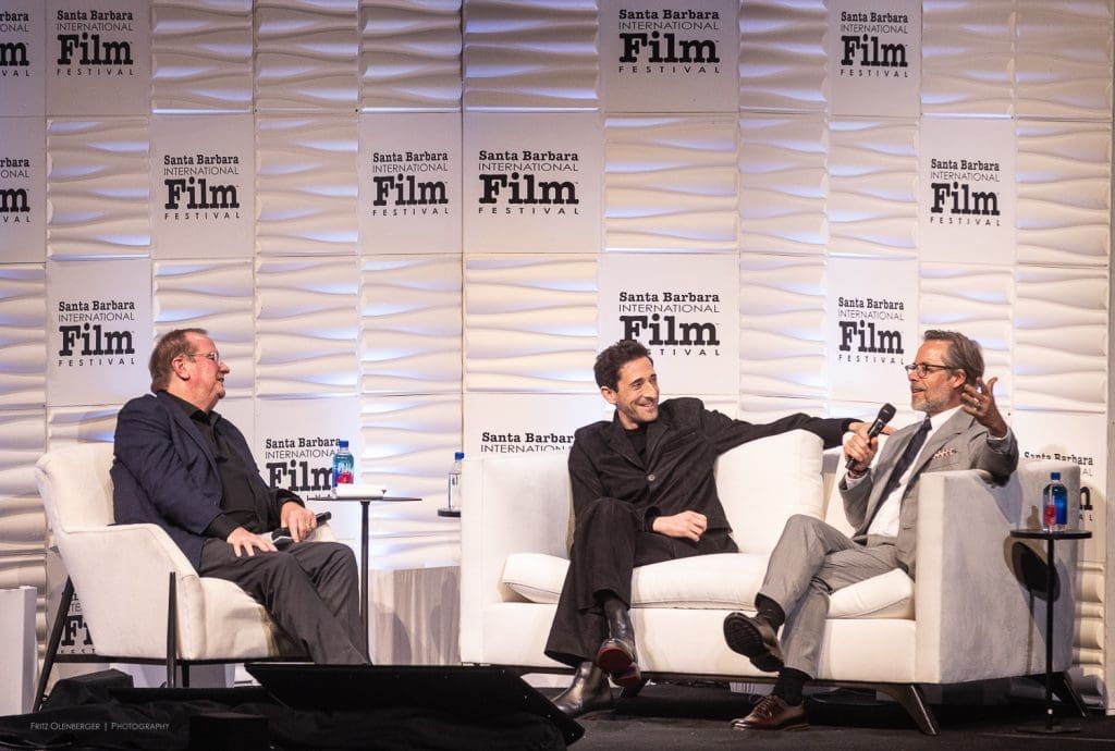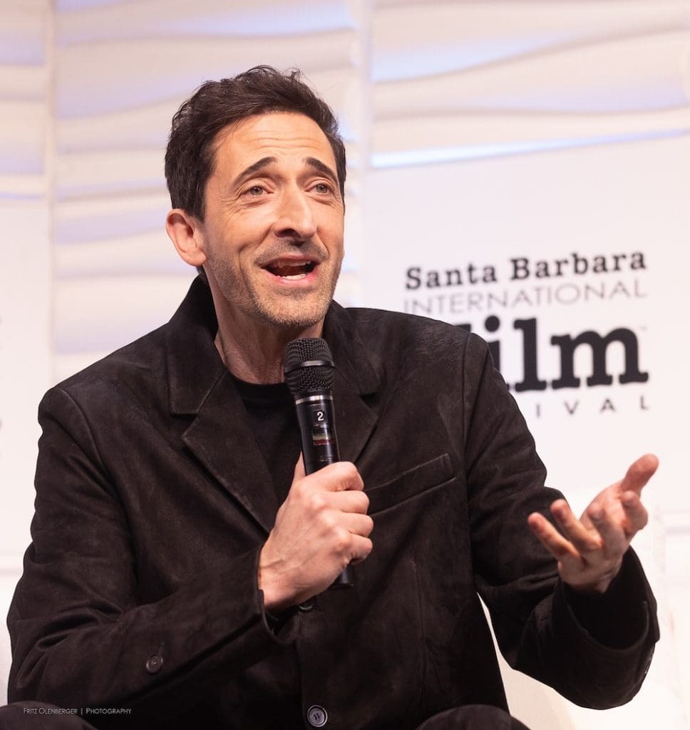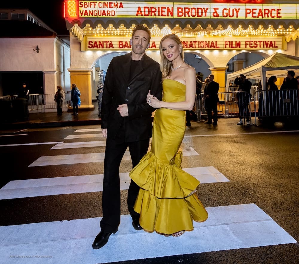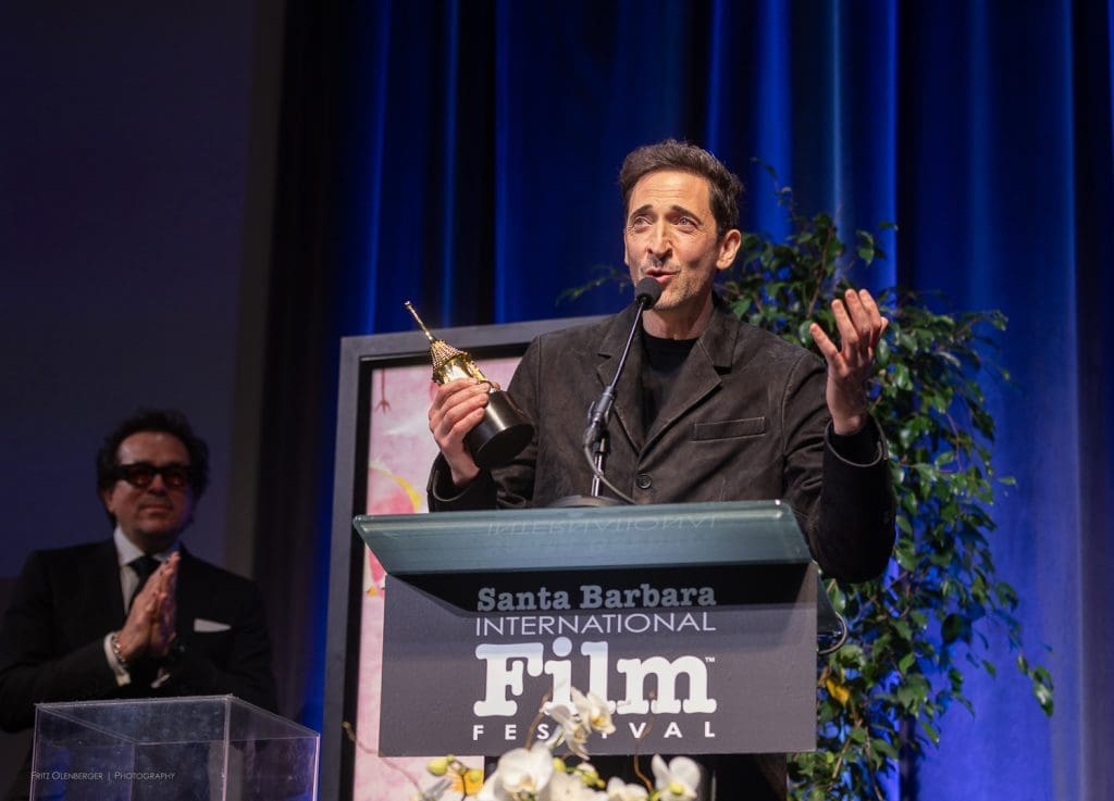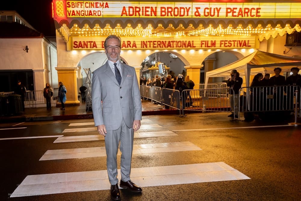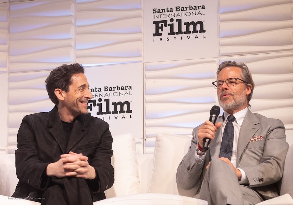 Another new format on Thursday for the Santa Barbara International Film Festival (SBIFF) Cinema Vanguard Award: the two actors from The Brutalist, Adrien Brody and Guy Pearce, were honored together. Brody has been nominated for an Actor in a Leading Role Oscar (and won the Golden Globe award for Best Actor in a Drama), and Guy Pearce has been nominated for Actor in a Supporting Role (his first Oscar nomination).