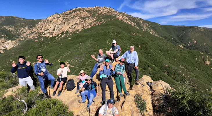 We finally reached the top of that Mission Ridge climb. I then launched my drone for a nice view of us with “Rocky Pine Ridge” (also known as The Rock Garden) behind us! Just below me is UCSB math professor Xianzhe Dai. Next to him is fellow UCSB math professor Guofang Wei. They also happen to be married! And they brought three of their graduate students along, who are sitting near them!