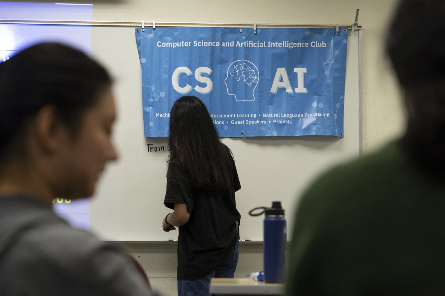 At Cal Poly San Luis Obispo, students in the Computer Science and AI Club meet every Sunday afternoon in a large lecture hall. On a recent Sunday, 80 students, mostly computer science freshmen, sat in front of two projectors to learn about AI basics from club leaders.