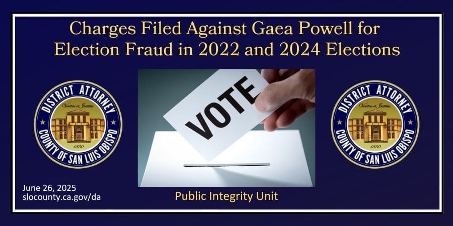 On June 24, 2025, the San Luis Obispo County District Attorney’s Office filed charges against Gaea Edde Powell (62) for voter registration fraud, filing a false declaration of candidacy, fraudulent voting, failure to file campaign finance reports, and for perjury by declaration. These crimes are alleged to have occurred during the 2022 and 2024 Arroyo Grande Mayoral election cycles.
