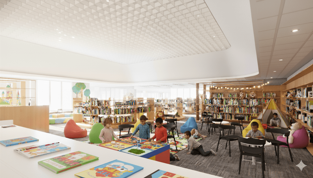 The donation will fund several new and reimagined elements of the children’s area, including: comfortable and modern seating for all ages and bodies; activity stations and interactive spaces to support early literacy skill development; a designated Teen Area with collaborative seating for reading and gathering; performance space for year-round shows that educate and inspire; upgraded technology for safe and responsible use; updated shelving to foster browsing and promote reading; and much more. The children’s area design strives to make this portion of the library a place where all feel welcome to discover the joys of reading in a safe, accessible community atmosphere.