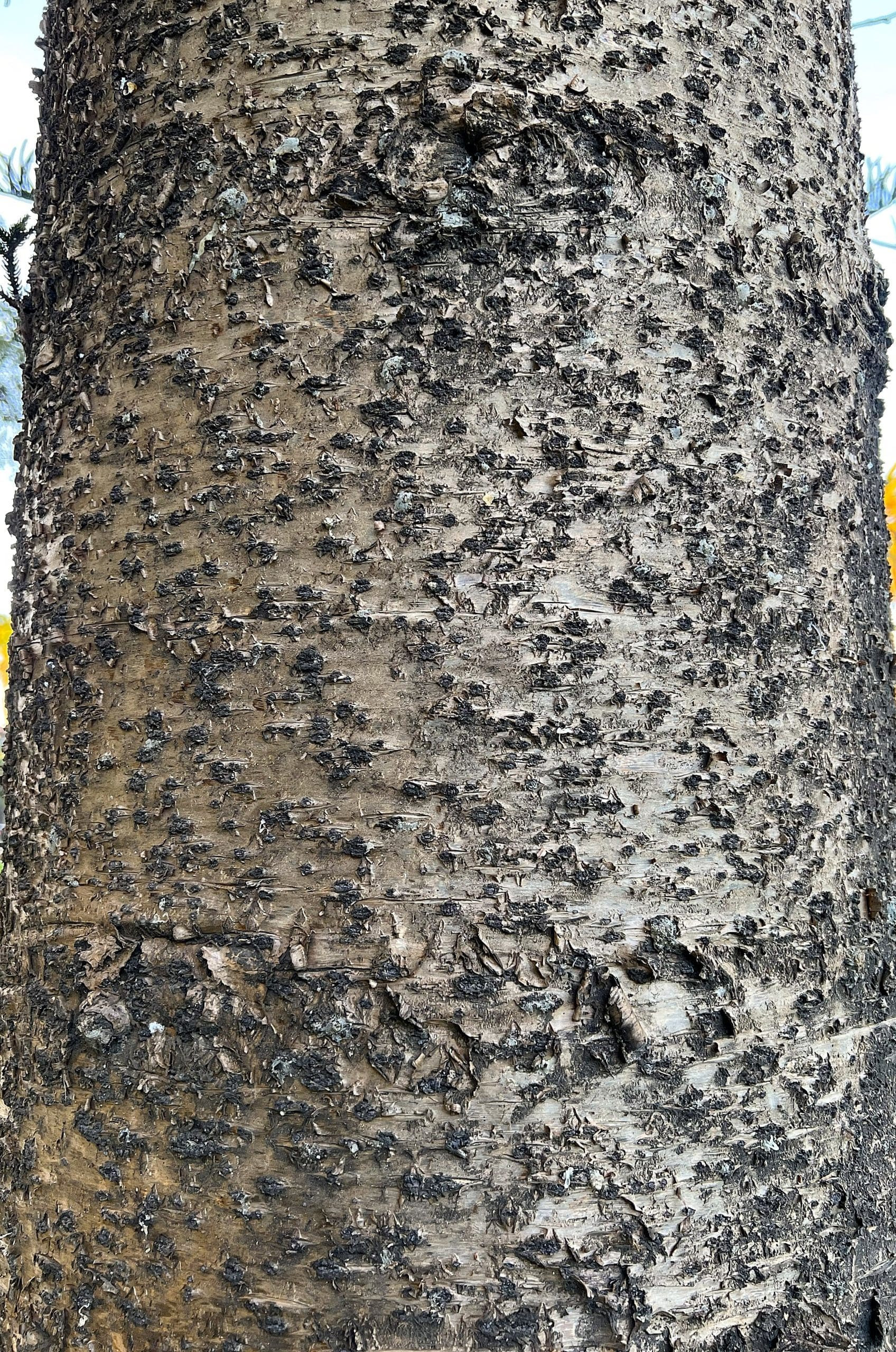 Norfolk Island Pine is notable for its symmetrical form, with whorls of horizontal branches widely spaced apart along an otherwise bare, straight, single trunk. Its dark brown to black bark is rough and peels off in thin layers.