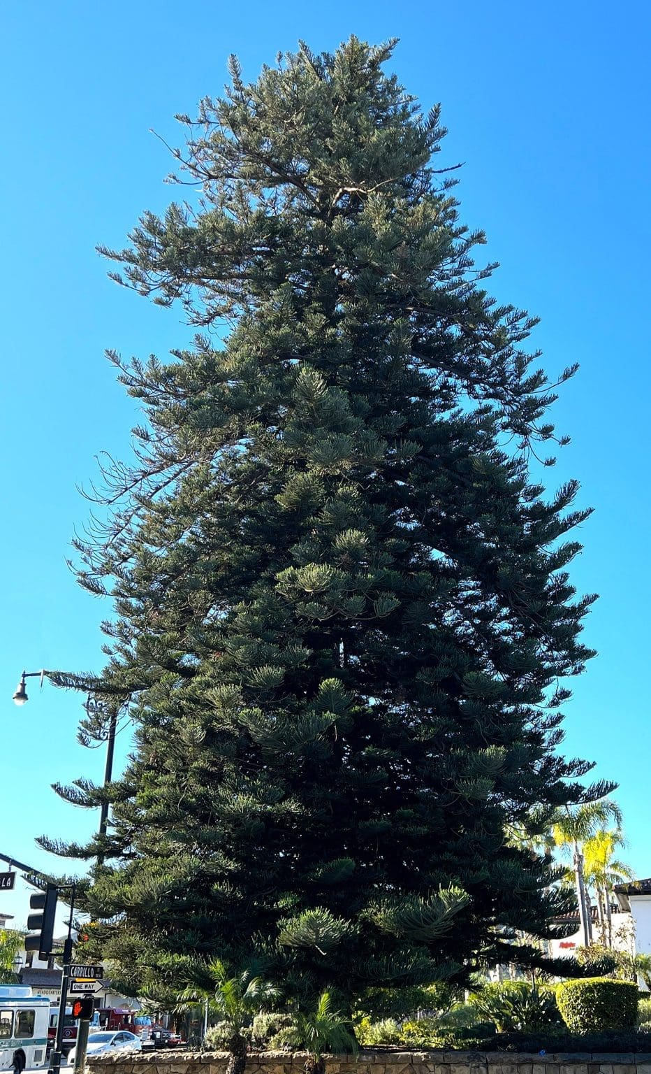 Specimens of mature Norfolk Island Pine can be seen in many places around town: on the southwest side of the County Courthouse (at the corner of Anacapa Street and E. Figueroa Street); in East and West Alameda Parks; at the Santa Barbara train station; on the grounds of Our Lady of Sorrows Church (Anacapa Street at E. Arrellaga Street); at 815 Quinientos Street; in private yards in the Upper East side; at UCSB; and, of course, at the corner of Carrillo and Chapala Streets.
