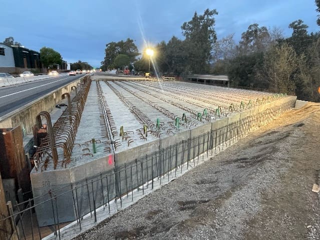 Caltrans has completed setting box girders as part of replacing the northbound US 101 Bridge at San Jose Creek in Goleta. These new girders were installed by crane during the overnight hours this week and will support the new bridge deck.