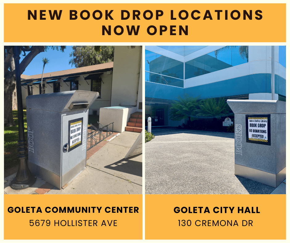 Book Drops: Book drops have recently been moved from the Fairview Avenue location to the Goleta Community Center (5679 Hollister Avenue) and City Hall (130 Cremona Drive) and are open to accept returns. Materials returned in the book drops are collected and checked in Monday – Friday. Please do not deposit donations in the book drops as we are not equipped to accept them at this time.