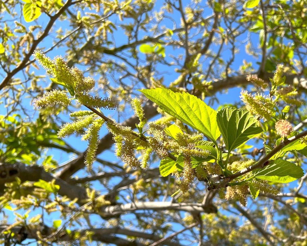 Fruiting mulberry trees are usually “dioecious”, which means male flowers and female flowers occur on separate trees – but some varieties are “monoecious”, which means both male flowers and female flowers occur on a single tree. In either case, in March through May, yellow-green, inconspicuous, tiny flowers form on drooping spikes, called “catkins” (1- to 2-inches long).