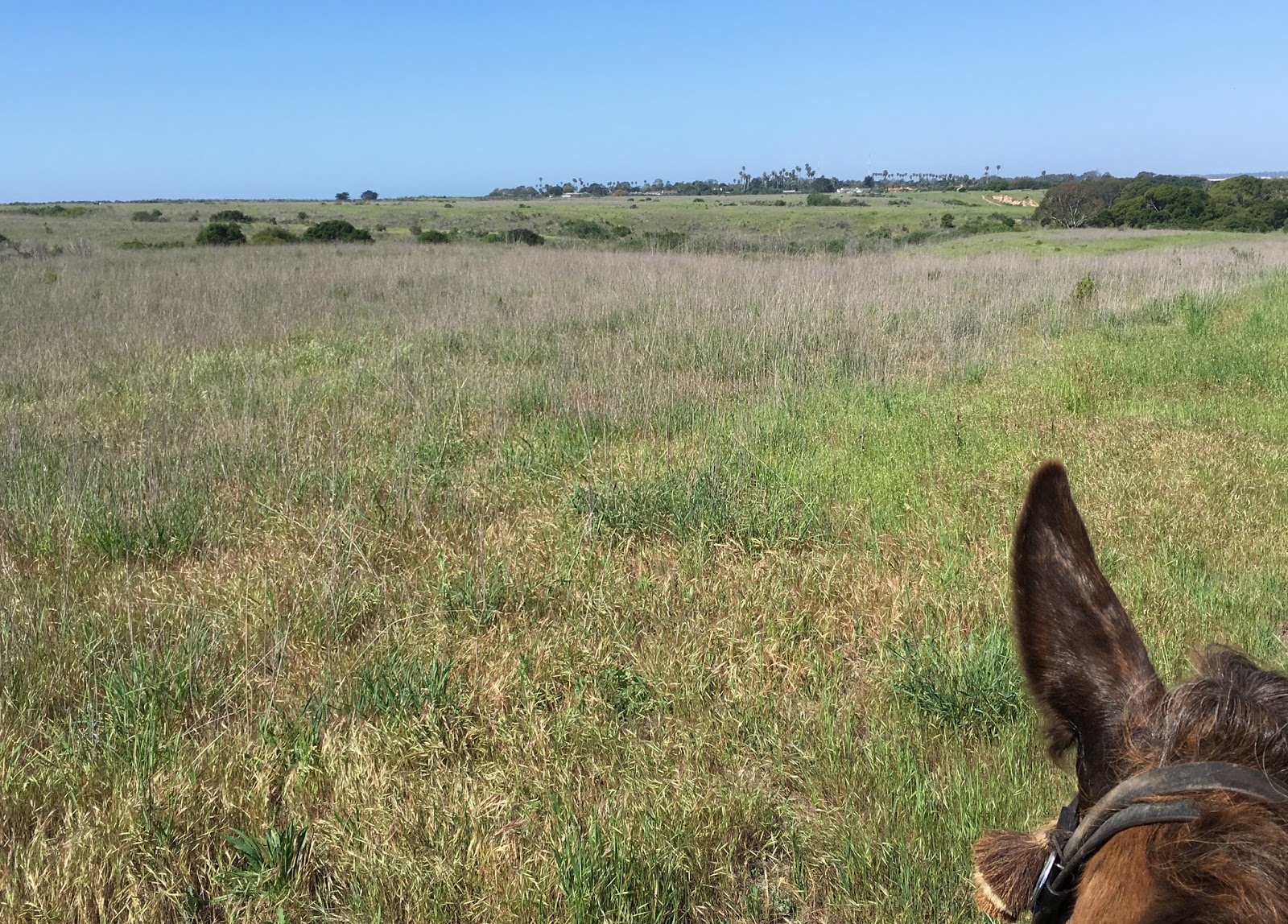 The islands are obscured by maritime haze on the horizon out to sea. But we have the pleasure of strolling across a natural grassland at the slow and steady pace of equine travel.