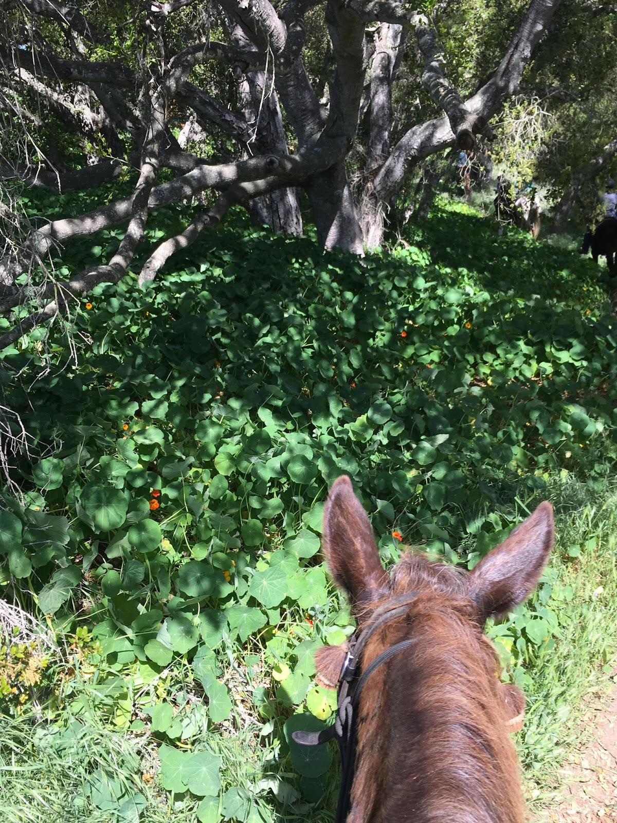Wild nasturtiums cover the shade underneath the oaks as we turn to follow a path alongside a drainage creek. The sounds of bird song fill the air, trilling and chirping in the branches above.