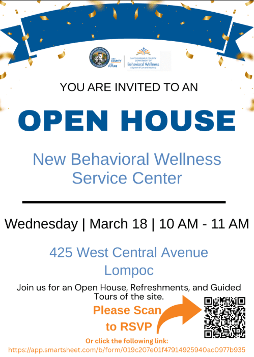 The Santa Barbara County Department of Behavioral Wellness will host an open house on Wednesday, March 18, from 10:00–11:00 a.m. to celebrate the opening of its new Behavioral Wellness Service Center located at 425 West Central Avenue in Lompoc.