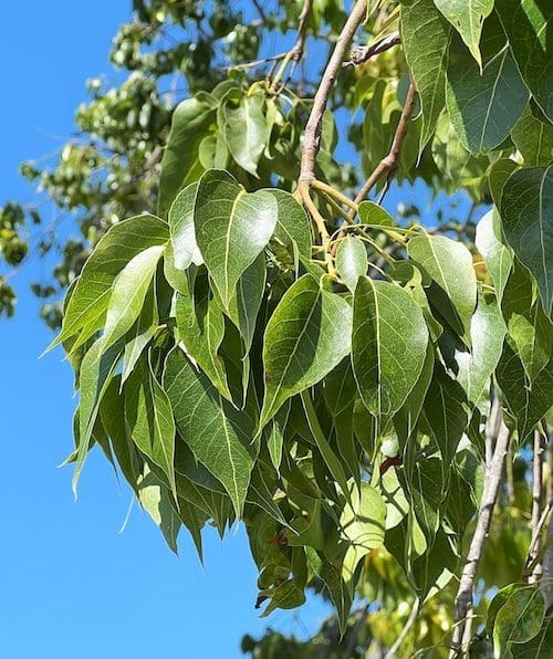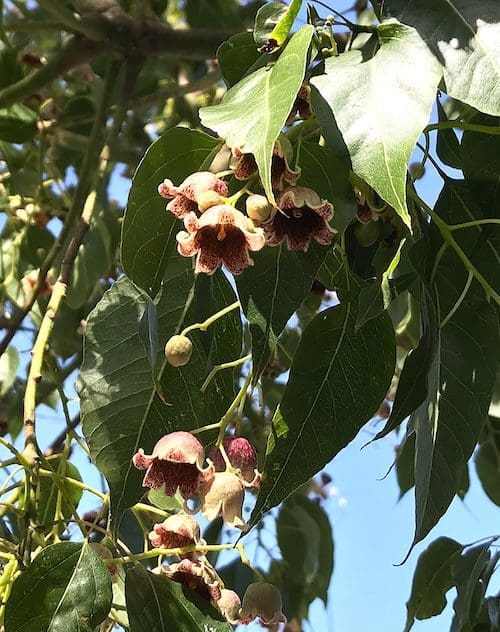 Its shiny green leaves strongly resemble those of poplar trees, an entirely different tree species. The leaves (2- to 3-inches long; 1- to 2-inches wide) are oval-shaped with a pointed apex.
