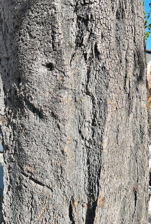 While it is in the same genus as other Australian bottle-trees, it rarely has the large wine-bottle-shaped bulge in the middle of the trunk that those develop. Instead, it has a rather expanded trunk near the root crown. When young, the bark is light gray; as it ages, it becomes darker gray. The bark normally has vertical fissures that are shallow – but can also have one or more vertical fissures that are long and deep.