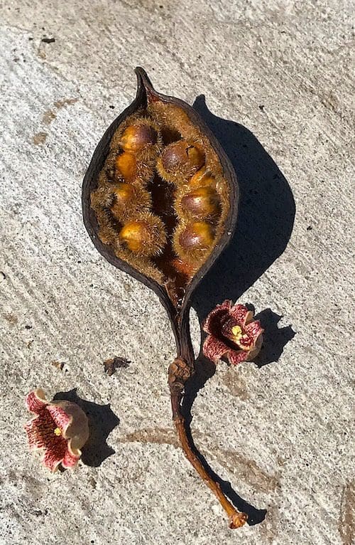 After the flowers are pollinated, (1- to 3-inches long), boat-shaped, seed pods form in large numbers. The green- to greenish-brown pods are smooth and leathery on the outside. As they ripen, they dry, turn a dark-brown, and finally split open lengthwise on one suture to reveal rows of orange-brown seeds that resemble kernels of corn. Each pod contains 8 to 12 seeds that are each surrounded by a sheath skirt that is covered with tiny protective hairs. Fair warning: these hairs can be quite irritating to the human skin – precautions should be taken when handling open pods!