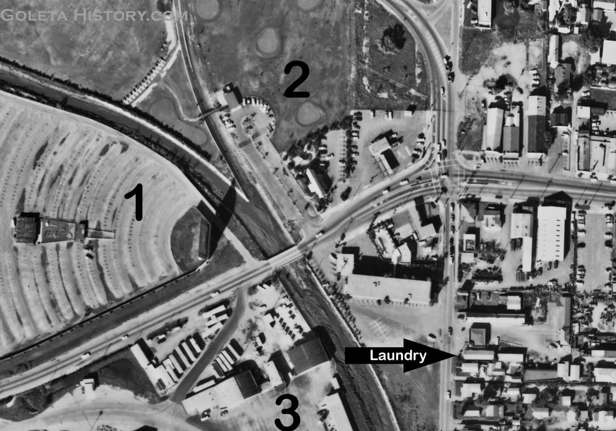 This 1965 shot shows the Orient Laundry building in place on Fairview Avenue. We highlighted a couple other fun things in Goleta in 1965. 1= the Airport Drive-In Theater in its prime. 2= Swingers Golf Course with a full parking lot. 3= Another glimpse of the Original Two Hangars.