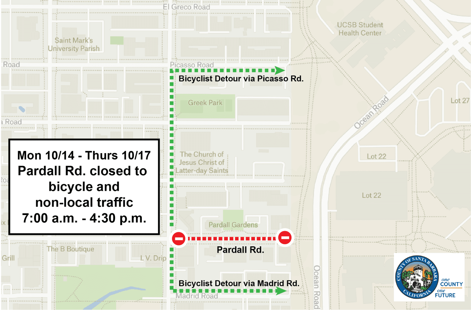 Next week, County Public Works will use heavy machinery to repair a section of sidewalk on the 6500 block of Pardall Road in Isla Vista. For the safety of the public, Pardall Road will be closed from Embarcadero Del Norte to the Ocean Road underpass.