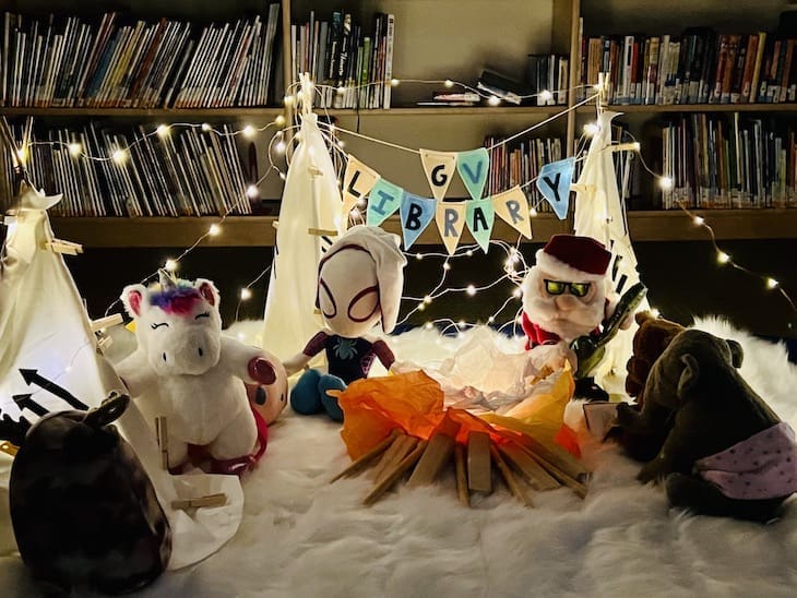 If you heard about the sleepover last year, you know it was anything but restful! The stuffed-animal friends had quite an adventure at the library where they were whisked away through the magical lands of their favorite stories and explored every hidden and not-so-hidden gem the library has to offer. This year’s fun included trying out the library’s new copy machine, using the ever-popular self-checkout machines, crossing a suspension bridge between bookshelves, racing one another in book basket cars, climbing a display tower like mountaineers, and much more! The toys were so inspired by all the books they had available that they finished their sleepover with a special group story time with Miss Linda.