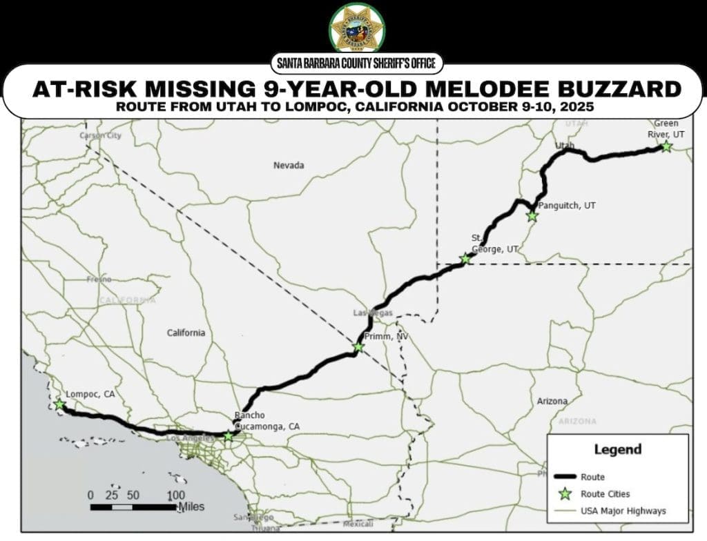 Santa Barbara County Sheriff’s detectives issued additional information Monday in their ongoing search for missing at-risk 9-year-old Melodee Buzzard that includes a new route map and surveillance photo that includes Melodee’s mother, Ashlee Buzzard.