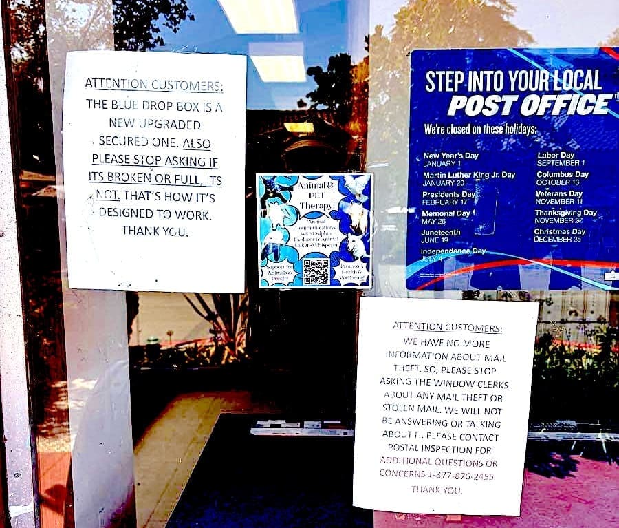 “ATTENTION CUSTOMERS: We have no more information about mail theft so please stop asking the window clerks about any mail theft or stolen mail. We will not be answering or talking about it. Please contact Postal Inspection for additional questions or concerns 1-877-876-2455. Thank you.”