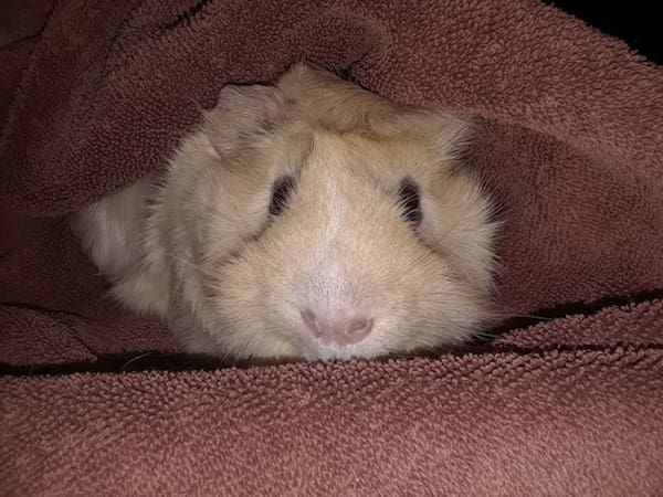 Cashew, a.k.a. the squeaky dictator, having an evening snuggle under a towel. Around feeding time, he starts squealing until we feed him. Also, any time he hears the vegetable bins being removed from the fridge, he ‘requests’ a snack