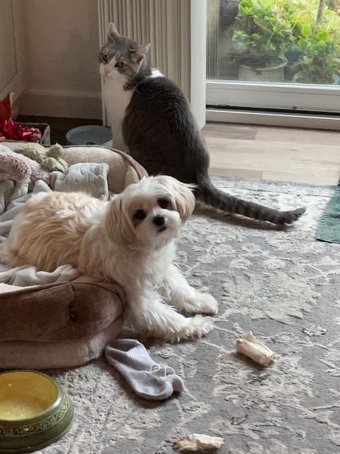 Here’s our baby Daisy she’s a rescue that was found in the streets abandoned, scared, matted fur and needing love. She is so sweet and so special I can’t imagine anyone leaving her. And with her is our princess kitty Lucy.