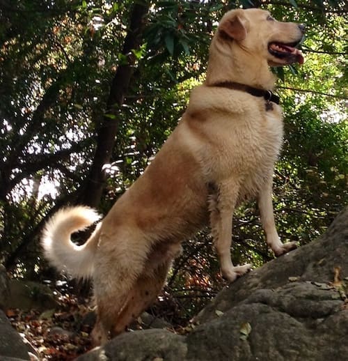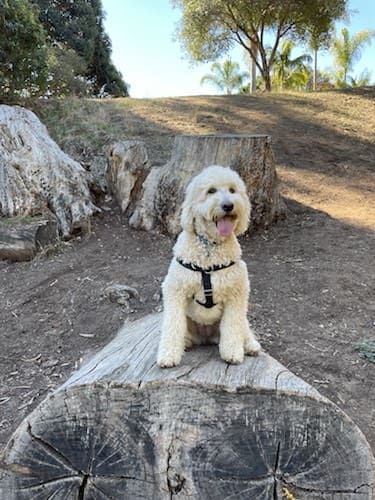 This is Freddie, she’s a 3 year old goldendoodle. Dog on a log. Pup on a stump.