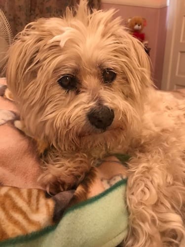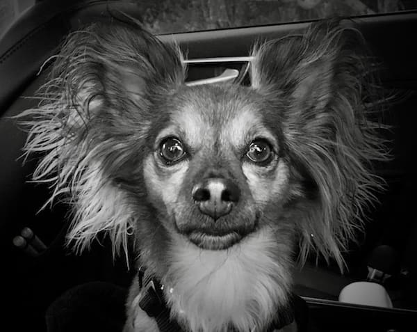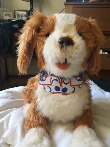 Wearing his Grateful Dead bandanna, indignant because he has to use batteries cause his owner can not walk a pooch anymore. So loving even so!