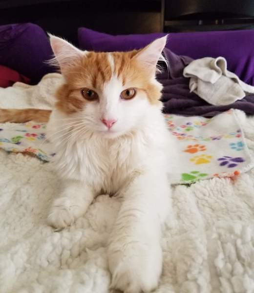 This is Sunny, he is 1 year old today April 11. Sunny has been with me since his birth. At 8 weeks old he got sick and went to a medical foster. At 11 weeks old the shelters Vet said he had neurological damage and should be put to sleep. I asked for him back and over 2 days nursed him back to health. Sadly the shelter still wanted to put him to sleep because of the Vets diagnosis. I adopted him and found out he was hypoglycemic and all he needed was some sugar to get his levels back up. Today he is 1 year old and a healthy 12 pounds. Sunny is the calmest kitty ever, he just loves to hang out with his humans. I am so happy I saved this beautiful kitty.