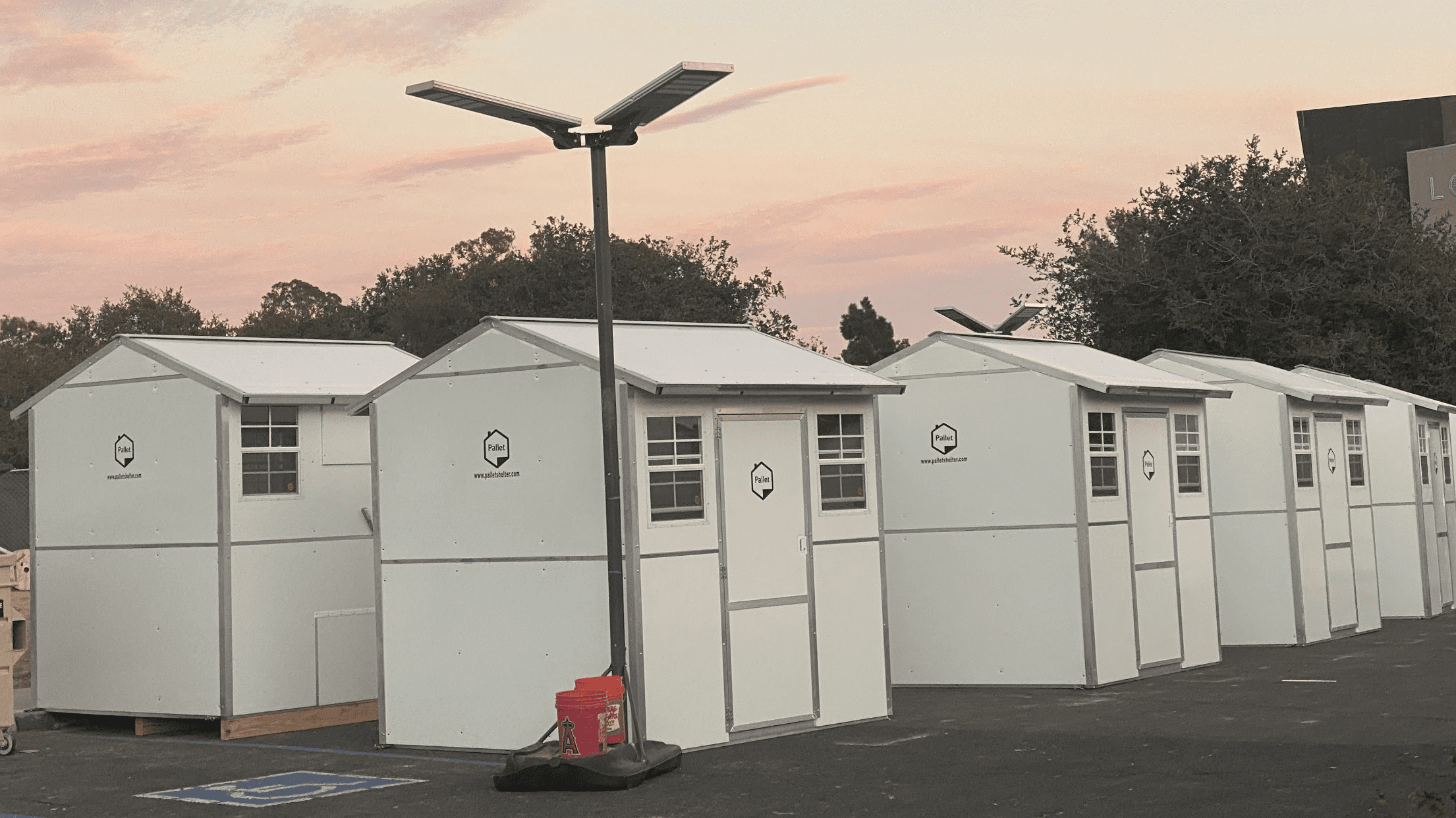 The temporary homes were made by Pallet, a company that builds low-cost, safe, and secure aluminum shelters for transitional housing for the homeless community and those recovering from natural disasters.