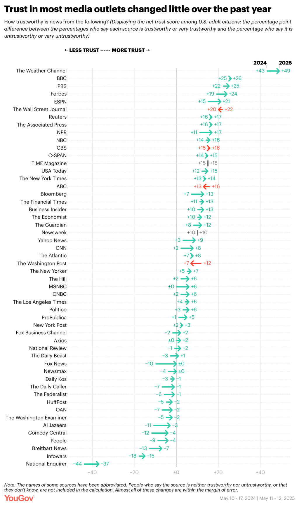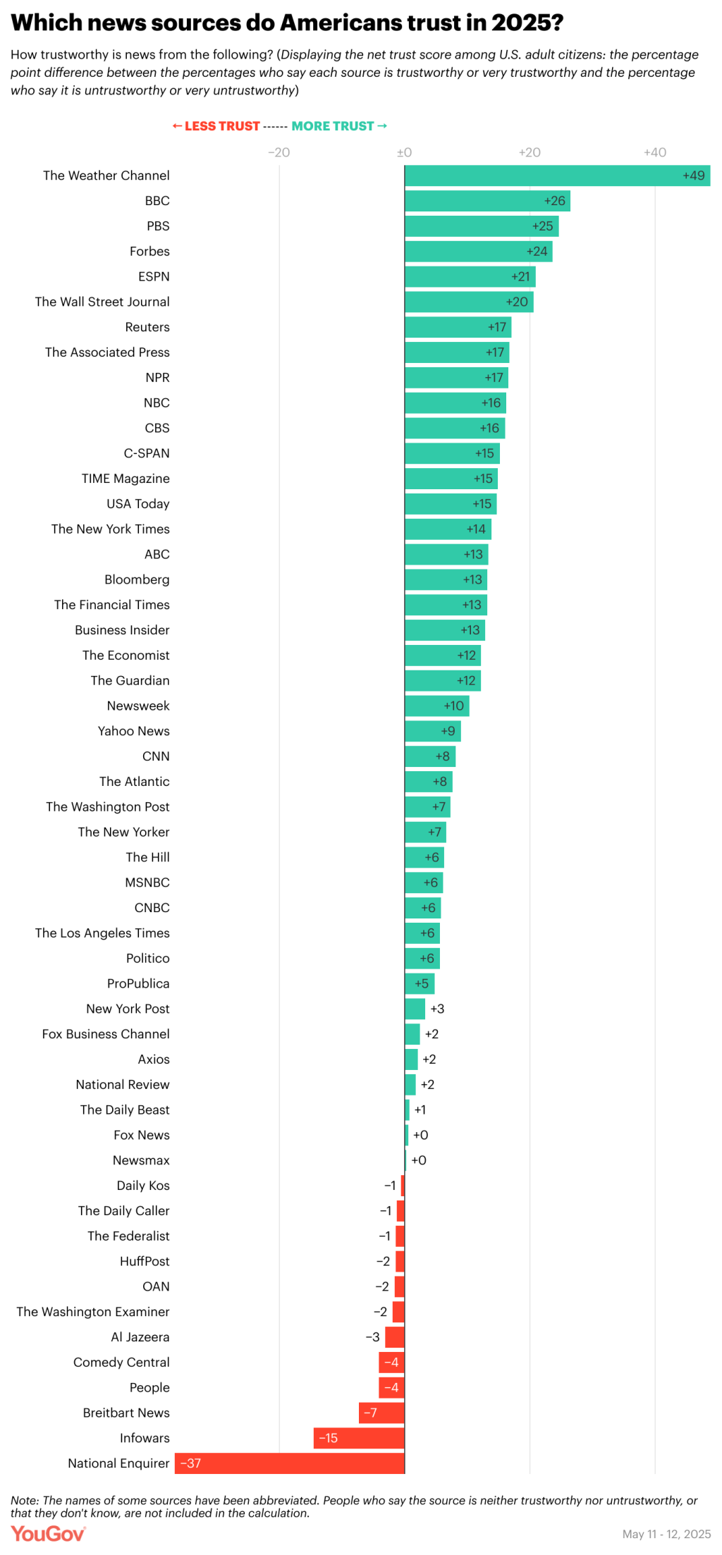 By far the least-trusted outlet included in the YouGov poll is the National Enquirer (-37, better than -44 last year, when it also ranked last for trust). The outlets trusted least besides the Enquirer are, like last year, Infowars (-15) and Breitbart News (-7).