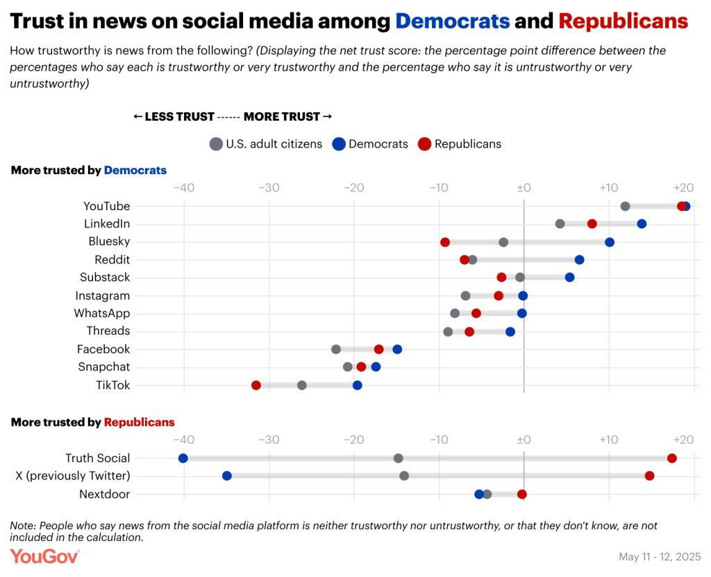 Americans are divided by age far more because of their trust in news from social media than for their trust in other sources of news. Adults under 45 are more trusting of news on social media platforms than older adults are — especially news from TikTok, Facebook, Instagram, YouTube, WhatsApp, and X. The higher levels of trust in X and Truth Social among younger adults is striking because older adults are more likely than younger ones to be Republicans.