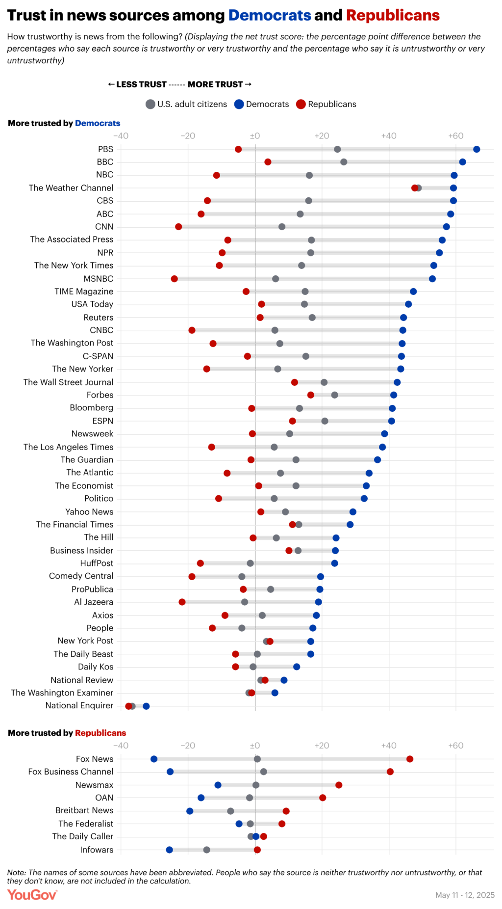 Like in last year’s survey, YouGov asked Americans in 2025 whether they find news from each of 52 outlets very trustworthy, trustworthy, untrustworthy, very untrustworthy, or neither trustworthy nor untrustworthy. Using these results, researchers calculated each outlet’s net trust score — that is, how much more likely Americans are to say the outlet’s news is trustworthy or very trustworthy than untrustworthy or very untrustworthy.